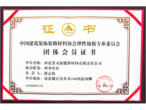 中国建筑装饰装修材料协会弹性地板专业委员会团体会员证书