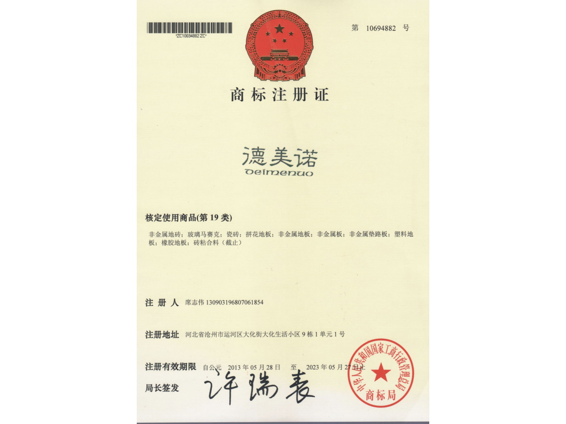 德美诺商标注册证