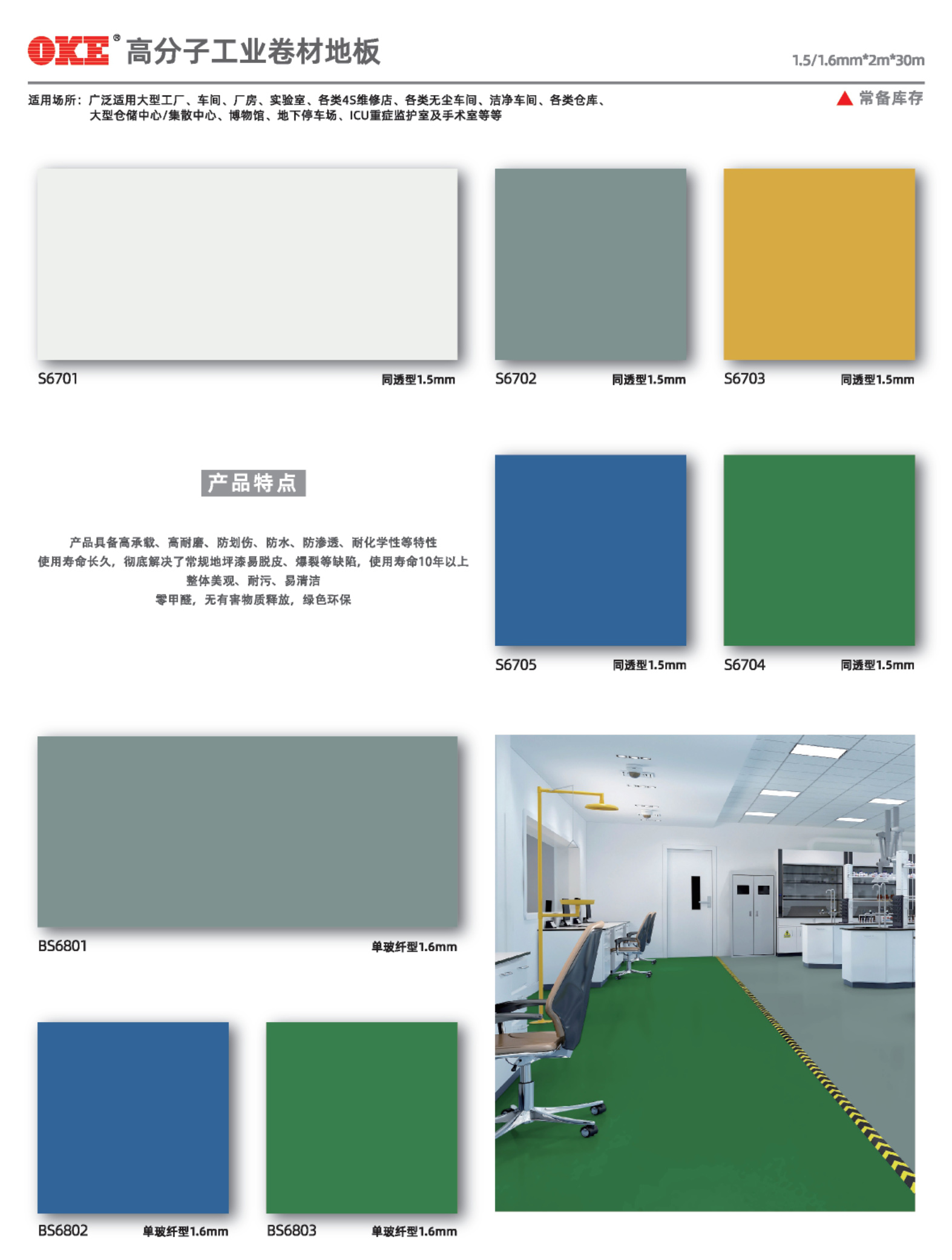 通体卷材工业地板是一种为轻工业环境设计的以高分子聚合物为主要材料的卷材地板,是以多种高分子聚合物材料通过高聚合轮压工艺制成。具有超级耐磨、耐压、降噪、抗渗、防腐、防火、抗菌等符合轻工业地面使用环境的理化性。解决了传统地坪在应用和使用过程中易脱落、脱层,使用寿命周期短,影响美观的短板,节省了在改造和维护过程中的投资成本和费用。