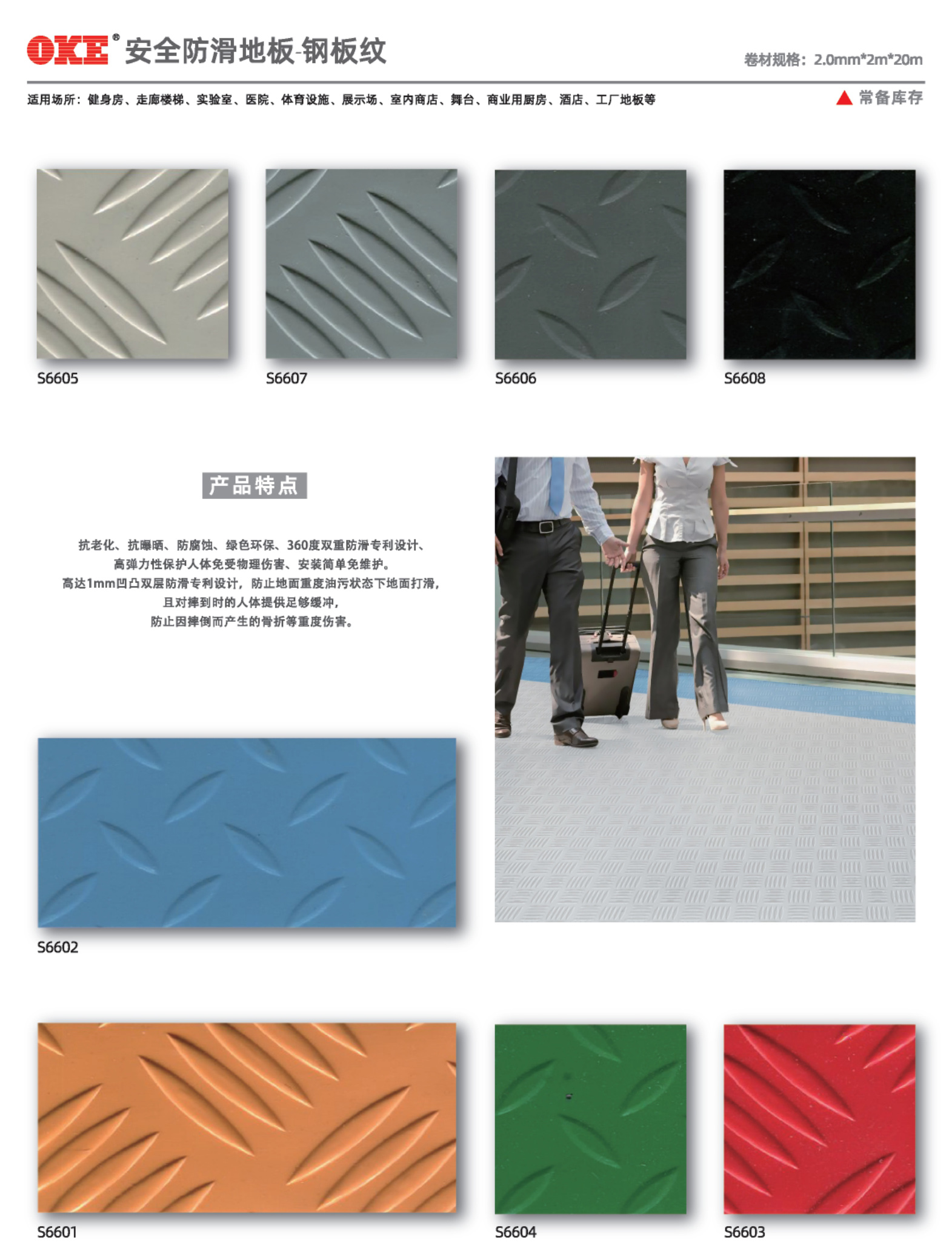 OKE功能型安全地板,该系列包括圆浮点、钢板纹、泳池地板、医用墙塑,适用场所广泛,具有耐磨、耐压、降噪、抗渗、防腐、防火、抗菌等符合轻工业地面使用环境的理化性地点限制,可选择在公园,海边,乡间小路,体育馆的跑道等地方。